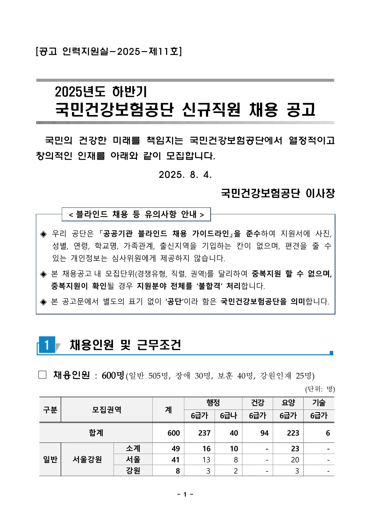 2025년 하반기 국민건강보험공단 신규직원 채용공고