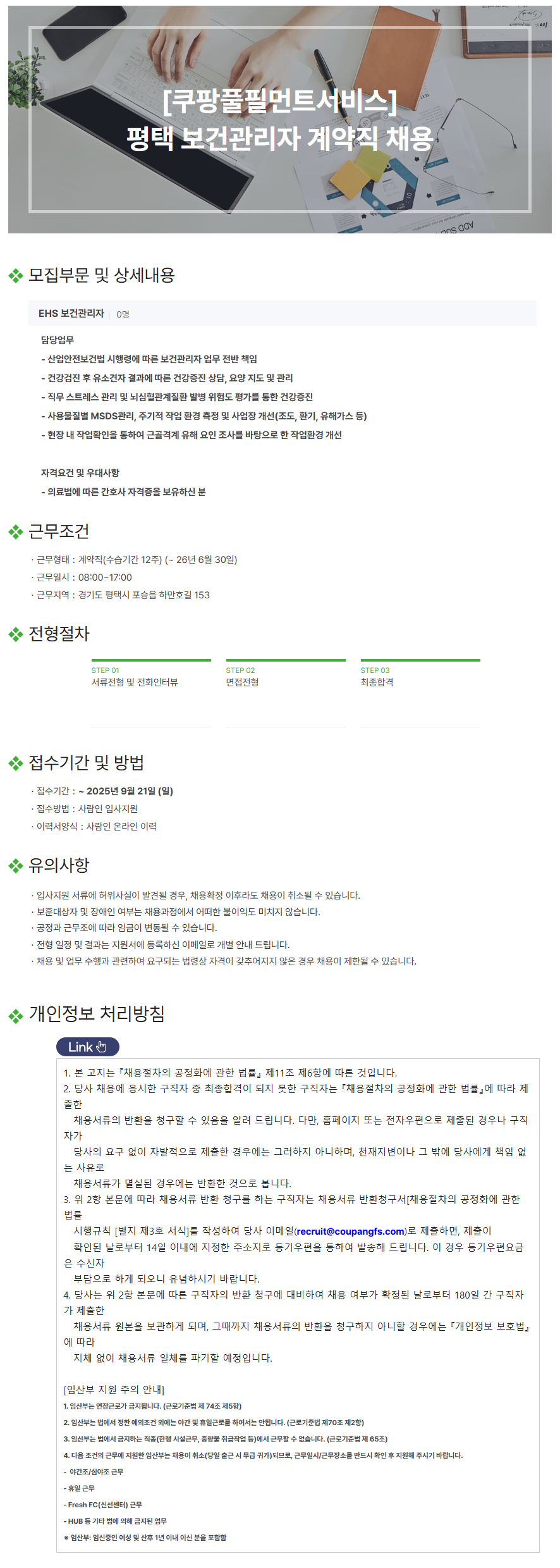 [~9/21] 쿠팡풀필먼트서비스(유) 2025년 평택 보건관리자 계약직 채용공고