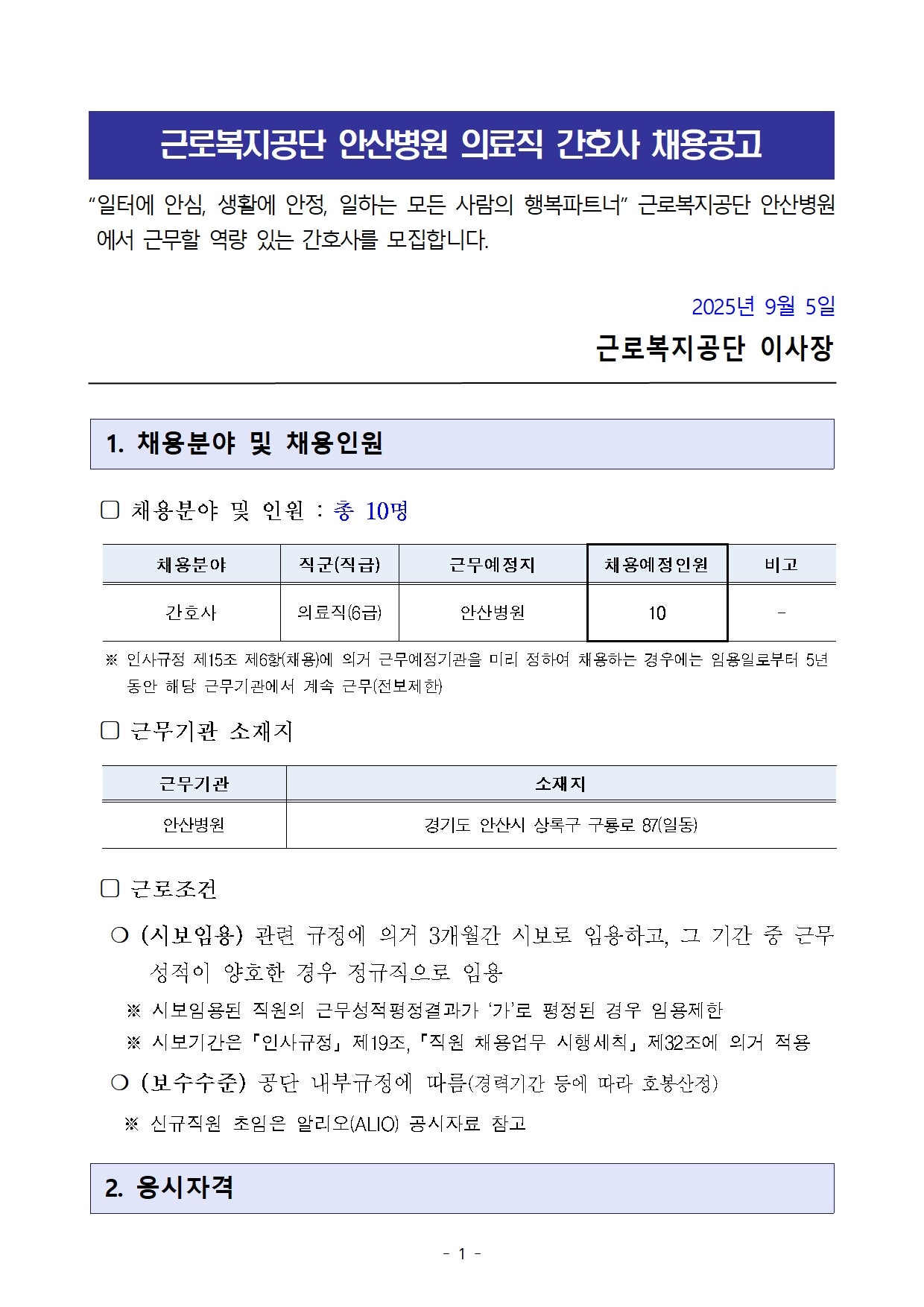 근로복지공단 안산병원 2025년 의료직(간호사) 신규채용공고