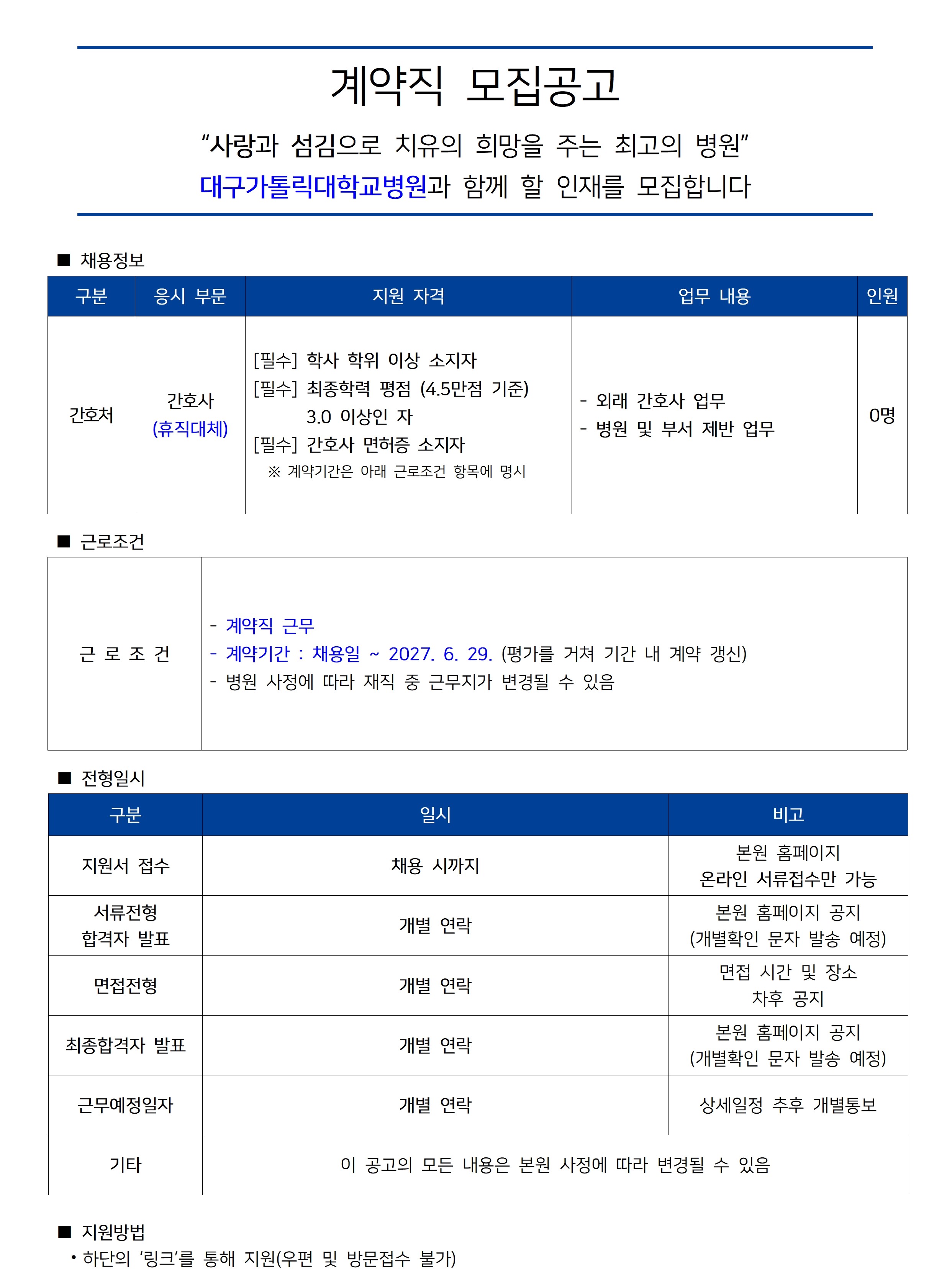 [~10/31] [채용시까지] 대구가톨릭대학교병원 2025년 간호처 간호사(휴직대체) 공개채용공고